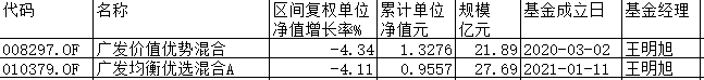 这2只基金分别为广发价值优势混合、广发均衡优选混合A,截至8月底,今年前8月收益率分别为-4.34%、-4.11%。截至二季度末,其规模分别为21.89亿元和27.69亿元。