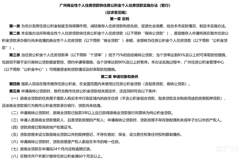 《广州商业性个人住房贷款转住房公积金个人住房贷款实施办法(暂行)》(征求意见稿)(央广网发 图片来自广州公积金中心官网)