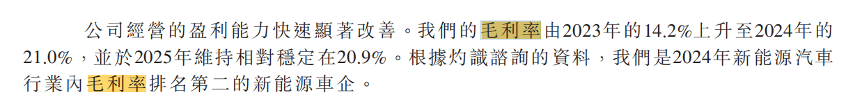 同期,岚图汽车的毛利率由2023年的14.2%上升至2024年的21.0%,并于2025年维持相对稳定在20.9%。根据灼识咨询的资料,该公司是2024年新能源汽车行业内毛利率排名第二的新能源车企。